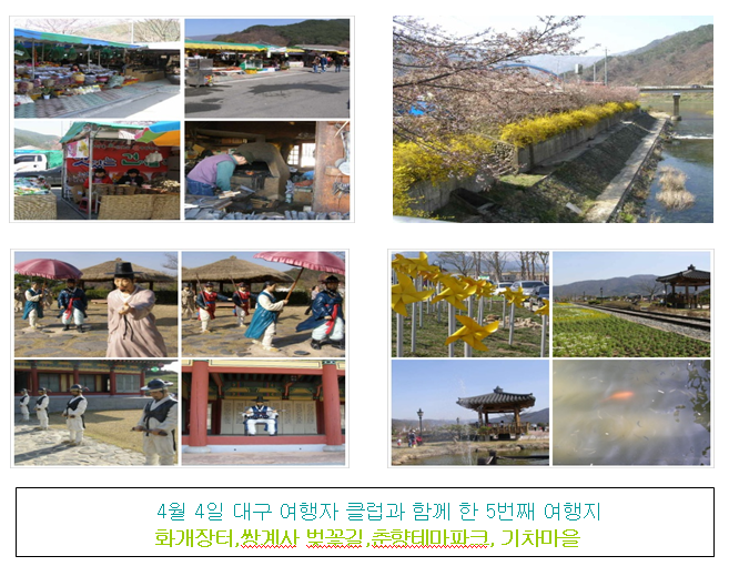 제목 | 5번째 여행-화개장터,쌍계사벚꽃길,기차마을,춘향테마파크 | 등록일 | 10.04.30 | 조회 | 570 |