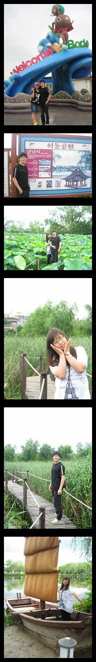 7월 17일 ^^;; 떠났습니다. 머드축제로 ~ 태어나 처음으로 머드 축제라는걸 간다는 생각에 밤잠을 설쳤고~ 설레이는 마음을 앉고 있었지만 밤새 심한 비바람으로 아침에 눈을 떳을때 여전히 내리는 비방울로 마음고생 심하게 한 후 떠난 여행이었습니다. 부모님들의 "폭풍친다는데 어딜가노??"라는 말과 " 너희는 뉴스도 안보나?"라는 말을 뒤로한채 구여행자클럽의 버스를 타고야 말았습니다. 버스를 타고가는 내내~ 전 생각했습니다. 비가 그칠꺼야.. 그칠꺼야 라고요~ 머드축제하는 보령에 버스가 도착했을때에 비가 조금씩 내리더군요~ "뭐~ 이정도면.. 좋아~" 라고 생각하던 이찰라에~ 입구에서 사진을 한방 찍자 마자 퍼붓는 비바람.. 어쩔겁니까.. ㅠ.ㅠ 바닷물 한번 젹시지도 않았는데 옷은 흠뻑젓어 있었고~ 서서히 몸이 않좋아져.. 이리저리 실내에서 할 수 있는 곳을 찾았습니다. 온 동네 에어컨 바람에 비에젓은 우리는 들어갈 수 없었고 짊을 맏기느라 정신없이 돌아다녀 물품보관함을 찾았으나.. 꽉찾다고하여 다시 바닷가의 물품보관함을 찾았는데.. 왠걸 무려 5천원이나 하는것이 아닙니까.. 그래도 어쩌겠어요 가방을 넣고 신나게 한번 놀아볼려고하는데 비바람이 그칠생각을 하지 않고 ㅠ.ㅠ 그래서 다시 마음을 돌려 실내에서 즐길수 있는 곳이 있다는 가이드말이 생각나서 그곳을 찾게되었습니다. 그러나 10분을 넘게 걸어가도 그곳은 보이지 않았고 비바람은 더욱 세차게 몰아쳐서 결국에서 그냥 머드는 포기한채 앞에 보이는 목욕탕을 찾아~ 사우나를 즐겼습니다. 그런후 "괜찮아 이것도 다 추억이지.. 언제 이렇게 비를 맞으며 바닷가에 와보겠어"하며 아쉬운 마음을 달래며 버스를 탔습니다. 비바람 때문인지 버스를 탄 몸은 힘들어 잠에 골아떨어지고 두번째로 도착한 궁남지.. 비가 그쳤더군요~ 서동요를 촬영한곳~ 일단 비가 안와서 완전 좋았고 넓게 펼쳐진 공원과 연꽃들 거기에 얽힌 사랑에 대해 알고 난 마음이 한결 편안해졌습니다. 비록 비가 와서 처음부터 신나게 즐기지는 못했지만 또 하나의 멋진 추억을 만들수 있는 기회가 아니였나 생각해봅니다. ^^ |