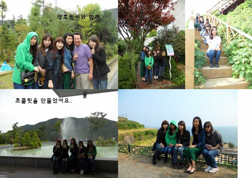 드디어 예쁜 친구들과 함께 보물섬 남해로 갔습니다. 아침부터 비가 주륵주륵 내려와 조금은 속상한 마음으로 비가 안오기만을 기도하고 또 기도하면서 남해로 내려갔습니다^^ 처음 간 곳은 바로 남해의 명소 원예예술촌이었습니다. 와우. 여기에 연예인 두분이 직접 기거하신다는 소리를 듣고, 대구살다보면 연예인 구경도 못하는 관계로 "아. 봤으면 좋겠다."라고 생각했는데, 가이드님을 따라 간 그곳에 본듯한 사람이 있어 봤더니. 와우!! 맹호림아저씨였습니다. ㅎ 악수하고 사진찍고, 아하하하! 박원숙씨도 있었다면 더 좋았을지도.ㅎ 하지만 너무 좋았다는.ㅋ 비는 약간 내렸지만, 사진만큼은 너무 잘나와서 기뻣습니다. 정말 하나하나 정성이 들어간 곳이라 그런지 너무 예뻐 마음을 빼앗겼습니다.^^ 정말 다음에 다시 또 가고싶어집니다. 솔직히 사진을 많이 찍을 시간은 없었습니다. 그래서 가이드님이 설명하실때 간간히 찍고 따라가고 그랬다는.ㅋ 그러다 보니 초콜렛 만드는 시간이 왔습니다. 와우. 초콜릿, 그것도 내가 직접만드는 초콜릿. 수제 초콜릿 후훗 그 향기가 아직도 코에 남아 있습니다.ㅎ 바로 출구까지 내려가면 바로 독일마을이 나옵니다. 시간이 촉박한지라 독일마을은 환상의 커플에서 "철수네집"을 보고 왔습니다. 하지만, 그 광경이 아직도 눈에 선합니다. 그리고 미조항에 가 바닷바람과 함께 간단한 점심을 먹고 마지막 코스인 다랭이 마을로 갔습니다. 기도가 이루어졌는지 날씨가 너무좋다못해 더웠습니다.^^ 삼천포대교밑 휴게소에 들러 마지막을 즐겼습니다. 아. 정말 너무 즐거웠습니다. 그날 저희들과 함께 웃음꽃 피워주신 가이드님 감샤합니다. 아! 다음엔 어디로. 갈지 고민..ㅋ |