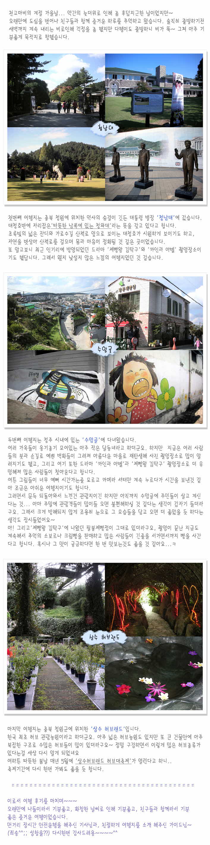 제목 화창한 날 기분좋은 여행~~(청남대/수암골/상수허브랜드) 등록일 10.10.11 조회 632