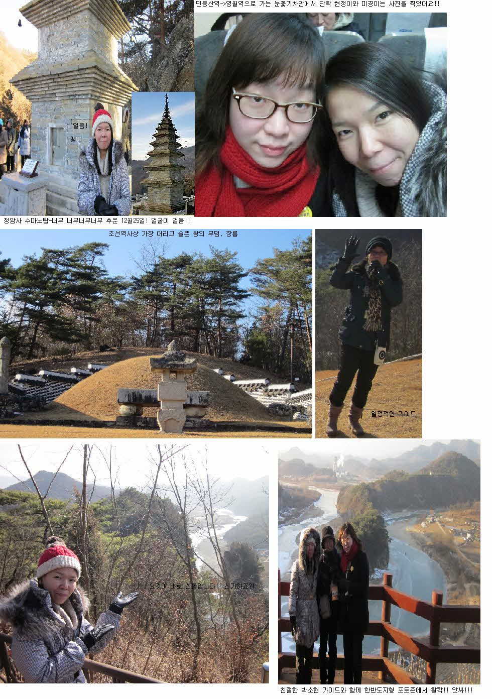 12월 25일 6:40 동아쇼핑 1번차량 탑승 가이드 : 박소현 [적명보궁 정암사 -수마노탑] 경건한 마음과 간절한 소원을 담은 탑돌이는 커녕 사진찍기조차 힘겨웠던 매서운 한파 민둥산역 식당에서 가이드님의 충고인 곤드레밥을 물리치고(이름의 마법; 먹었다가는 곤드레만드레될 듯한 기분! ㅎ) [민둥산역->영월행 태백선 눈꽃열차] 기차안으로 쏟아지는 햇빛덕분에 어떻게 찍어도 예쁜 사진이 나와서 흡족했어요! [어린왕의 슬픔이 머무르는 곳, 장릉] 역사가이드의 이야기를 들으며 12살 어린나이에 겪었던 슬픔과 고통으로 숙연해지는 기분.