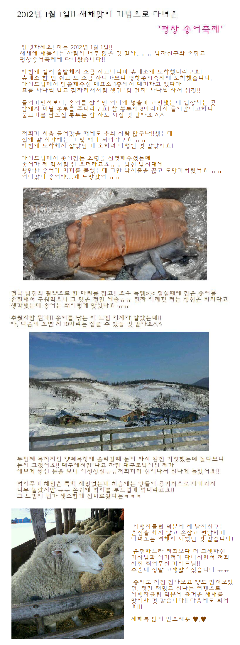 제목 평창송어축제!! 추웠지만 너무 기억에 남아요♥.♥ 등록일 12.01.04 조회 575