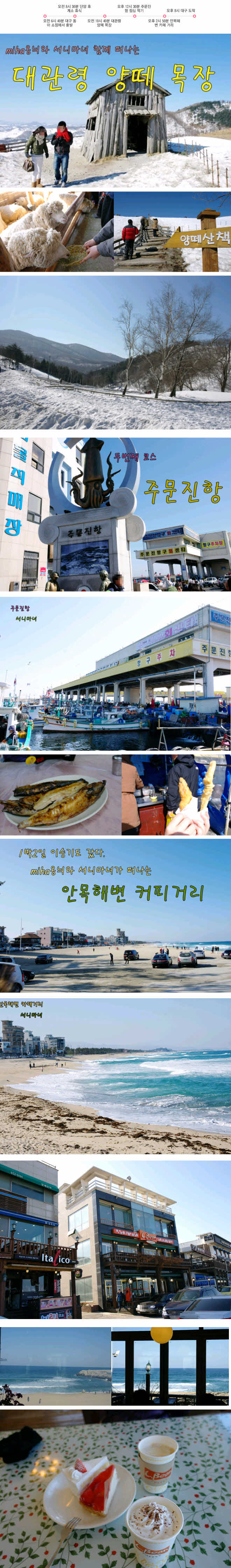 +동아쇼핑에서 버스탑승하고 우리의 첫코스인 대관령 양떼 목장에 갔습니다.주말이여서그런지 사람들이 많았습니다. 저희는 사람들이 많이 가길래 따라갔더니 등산코스더라구요. (옷이다 등산옷) 우리는 아 여기가 입구가 아니구나 생각하고 다시 원점으로 돌아왔어요. 다행히 입구를 표지판 발견~ ㅋㅋ 산책하면서 여유롭게 올라가보면 양건초 주는곳이 나옵니다. 봄,여름에 오면 들푸른 언덕도 이쁘지만 겨울 눈덮힌 언덕도 이쁘더라구요. 먼저 양건초주기 체험도 하고. 사진도 찍고 산책로도 돌아보고.. 이리저리 구경한다고 저희는 6분정도 늦었습니다. 얼마나 미안한지.ㅋㅋ +두번째코스는 주문진항 +마지막 코스는 안목해변커피거리. 이렇게 짧고도 긴 테마여행이 끝났네요 |
