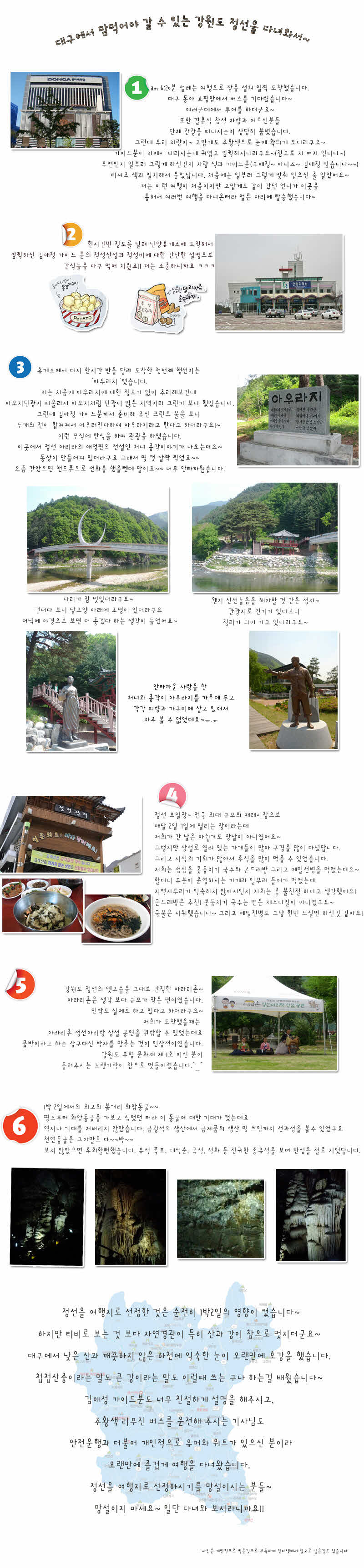 제목 ★대구에서 맘먹어야 가는 곳 강원도 정선(아우라지, 정선장, 아이랑촌, 화암동굴) 등록일 12.05.21 조회 811