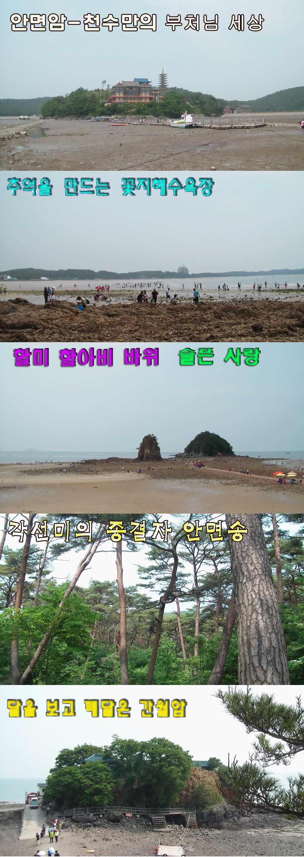 지난 6월 9일 2012년 들어 세번째로 여행자 클럽 문을 두드렸습니다. 안면도에서 천수만의 부처남 세상 안면암, 사람들이 이야기가 만들어지는 꽃지해수욕장, 승언과 미도의 아픈 사랑 이야기가 있는 할미바위, 각 선미의 종결자 안면송, 무학대사가 달을 보고 깨달음을 얻은 간월암을 만났습니다. 여행자클럽과 함께한 안면도 이야기입니다. 안면암_ 천수만의 부처님 세상 (자세히 보기) 처음 만나는 7층대탑은 대연각 석불의 미소가 머무는 곳은 전각과 바다 너머 진리의 세상 비로자나불 모신 비로전 아래엔 석탑과 오층 철탑이 비로전과 대연각을 바랍니다 나한 모신 나한전 옆에는 7층 3쌍탑이 있습니다 삼성각과 용왕각도 자리잡고 무량수전에는 큰 법당이 있는데 스님은 기도중입니다 물빠진 천수만에는 길이 열리고 중생들은 쌍둥이 섬으로 오갑니다 여우섬과 조그널 섬 사이에는 7층탑이 있습니다 바다에서 바라 보는 안면도에는 안면암이 마중합니다 보통 절의 전각들은 목재를 많이 쓰지만 안면암은 철판과 콘크리트로 이루어져있습니다. 그리고 단청의 색이 전통적인 사찰과는 다르고 그림의 문양도 특별했습니다. 1998년에 창건한 암자(庵子)이지만 큰 절입니다. 절 입구에 들어서자 7층 대탑은 탑의 형식으로된 큰 전각으로 이름은 대연각입니다. 대연각 옆에는 석불이 바다를 향하고 그 옆에는 비로자나불의 비로전이 있습니다. 비로전 아래서 만난 탑은 석탑이 아니라 5층 철탑이 있고, 앞에는 나한전이 있습니다. 나한전 옆에는 안면암 7층 3쌍탑이 남을 배려하는 삶을 가르칩니다. 오른쪽에는 삼성각과 용왕각이 자리잡고 앞쪽에 안면암의 법당인 무량수전이 있습니다. 무량수전에서는 스님의 기도가 함께 하고 있었습니다. 무량 수전에서 바다쪽으르 바라보면 쌍둥이 섬이 다가서는데 쌍둥이 섬 사이에서도 7층탑이 있습니다. 바다에서 되돌아 오는 길도 부처님의 세상입니다. 꽃지해수욕장_사람들의 이야기가 만들어지는 곳 (자세히 보기) 꽃다리에 안개가 걷히면 이야기가 만들어지고 속살 드러낸 갯벌에는 바다를 만나는 사람들 연무가 사라진 꽃지 바다에 추억을 쌓는 사람들 설물로 갯벌이 드러난 꽃지해수욕장의 풍경입니다. 꽃지라는 이름은 '곶'이 있는 곳 '곶지'가 '꽃지'로 바뀌었다는 설과 해변을 따라 해당화 매화가 많았다고 '꽃지'라고 불리었다는 설이 있습니다 . 3km가 넘는 길이의 백사장은 폭도 300m가 되고 그리고 적당한 수온과 할미 할아비 바위의 풍경 그리고 낙조까지 아름다운 곳입니다. 초여름에 만난 꽃지 해수욕장에는 안개가 신비로움을 더해주고 많은 이들이 갯벌 체험을 하고 있었습니다. 백사장 풍경도 멋지고 할미 할아비 바위도 하나가 되어있는데, 연인들은 꽃지 해변길의 꽃다리에서도 이야기를 만들고 있었습니다. 할미바위_승언과 미도의 아픈 사랑 이야기 (자세히 보기) 안개속에 숨어 있는 까닭은 천년도 넘은 부끄러움일까 함께 할 수 없는 승언과 미도 썰물에 드러난 모습은 할미는 아직도 푸르고 할아비는 우뚝하네 살포시 겹쳐 보지만 그리움은 숙명이리라 끝없는 기다림만 남았네 썰물과 안개와 더불어 찾은 사람들을 즐겁게 하는 슬프지만 아름다운 사랑 이야기입니다. 아름다운 꽃지 해수욕장에는 수문장 처럼 두개의 바위가 있습니다. 신라 때 안면도 방어를 책임진 승언과 그의 아내 미도는 금슬이 좋은 부부였는데 청해진의 장보고의 명령을 받고 출정한 승언은 돌아오지 못 했습니다 미도는 기다리다가 바위가 되었답니다 지금의 할미 바위가 바로 그것입니다. 그리고 왼쪽으로 하나의 바위는 승언의 혼백인 듯합니다. 천년을 넘게 서로 그리워만 하고 있는 두개의 바위는 꽃지 해수욕장을 찾는 이들에게 아름다운 이야기를 전하고 있답니다. 바위만이 아니라 이 지역의 자명도 승언리랍니다. 안면송_각선미의 종결자 (자세히 보기) 붉은 빛을 띤 소나무 줄기 하늘을 향해 쭉 뻗어 올라간 모습이 장관입니다. 안면도의 소나무 안면송은 각선미의 종결자이기도 합니다. 예전에 궁궐에서도 사용한 안면도의 소나무는 나무 숲 속에 들어선 저의 온몸이 느낄 수 있는 향기를 뿜었습니다. 시원한 바람과 함께 몸과 마음을 씼어주는듯했습니다. 안면도에서 만날 수 있는 특별한 소나무 안면송입니다 간월암_무학대사가 달을 보고(간월-看月) 깨달은 곳 (자세히 보기) 물 빠진 바다에서는 갯배도 할일이 없습니다 당우는 바위 위에 자리 잡고 작은 문이 일주문이 됩니다 푸르름이 더해가는 사찰에는 사람들이 있습니다 간월암에는 부처님 계시고 작은 전각엔 목탁이 있습니다 산신각엔 신령님 모셨고 작은 종은 소원을 울립니다 보살의 기도가 있는 간월암은 바다와 어울렸습니다 충남 서산의 천수만에는 무학대사가 달을 보고 깨우침을 얻었다는 간월암이 있습니다. 물이 차 있다면 타 봤을 갯배는 바닥에 있었고 사찰이 있는 바위 주변을 한바퀴 돌아서 절 입구로 들어갔습니다. 무학대사가 기도할 때는 작은 암자였겠지만 이제는 제법 큰 절이 되었습니다. 기와 불사를 하고 돌아보는 절에는 많은 사람들로 붐벼서 조용한 모습을 보기는 어려웠지만 물이 차 있을 간