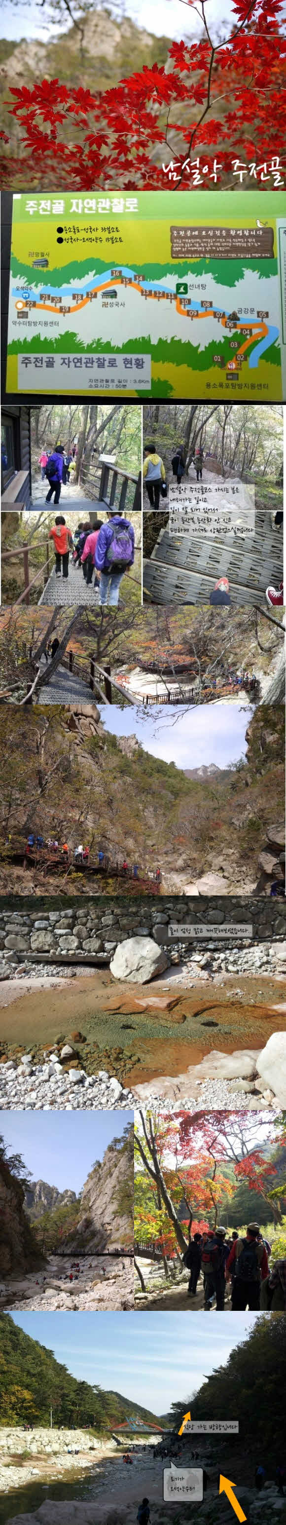 버스타고 이동하는 정상까지 갈때는 참 단풍이 이뻣는데.. 내리막길로 내려가니깐 점점 단풍이 보이질 않았습니다.. 저희들이 갔던 남설악 주전골 코스는 그래도 사진찍고 놀다보니 2시간 훌쩍 지나가더라구요... 거의 마지막부분에 선녀탕이 있는데 점심은 혹 도시락 안 사가지고 가시는분은 마지막으로 갔던 주문진항...