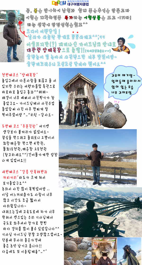 제목 대관령양떼목장.주문진항.강릉안목해변과커피거리코스 등록일 13.03.04 조회 548