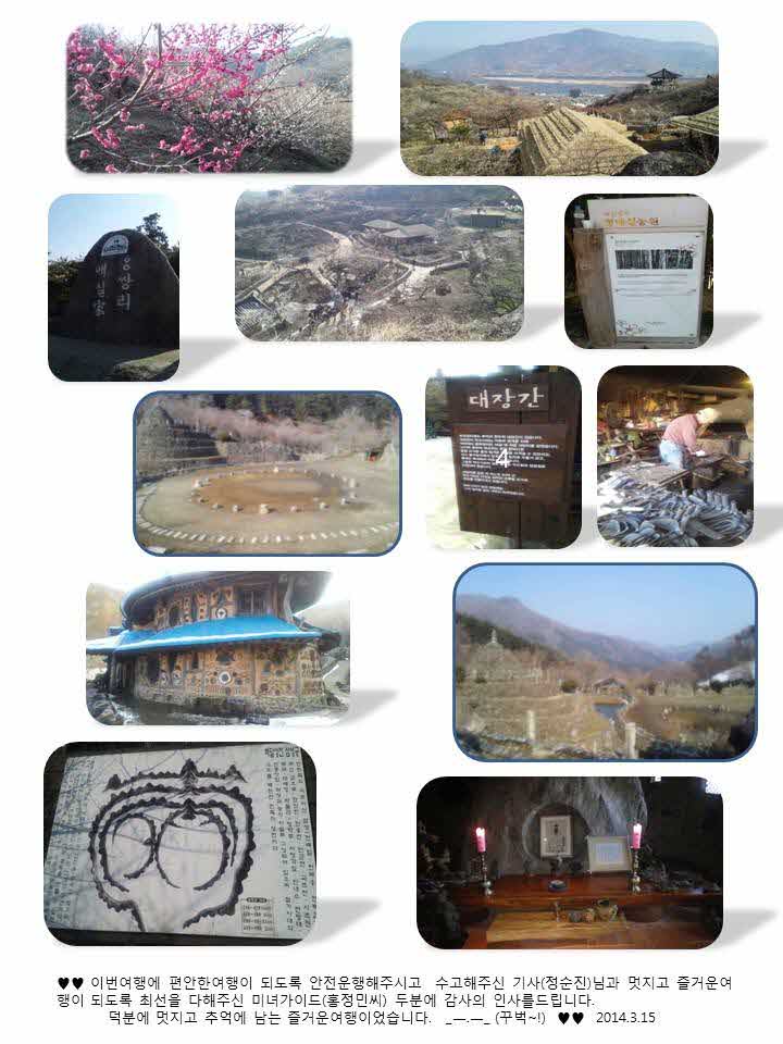 제목 친절한미녀가이드(홍정민)와동행 / 매화마을~화개장터~최참판댁~삼성궁 다녀와서 등록일 14.03.16 조회 632