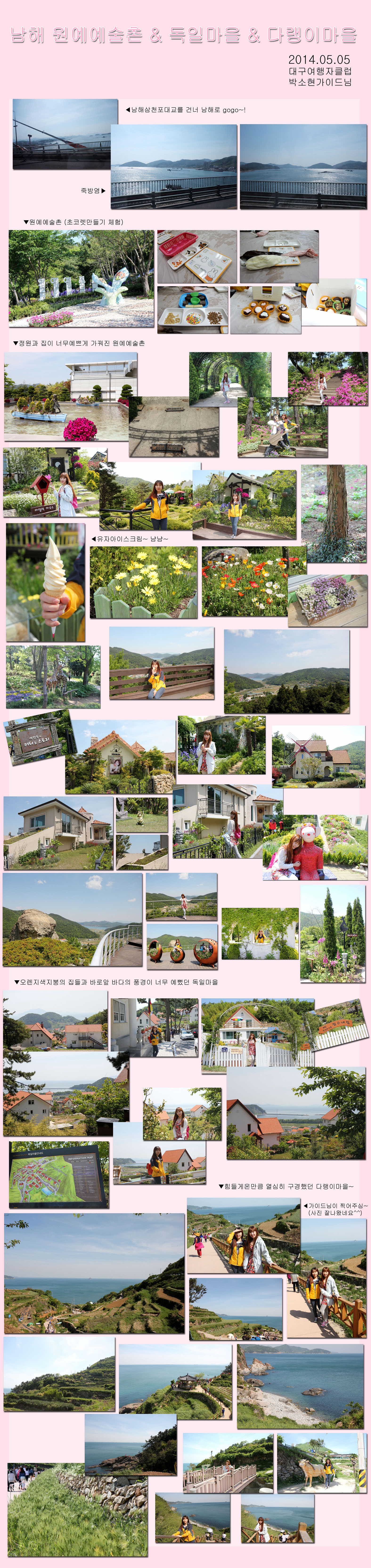 연휴를 알차게 보내기 위해 5월4일 일정을 마치고, 5월5일은 남해로... 외도여행 함께한 친구와 동행했구요~ 전날 교통체증을 실감해서 걱정했었는데 베테랑 가이드님 덕분에 일정도 알차게 다 소화하고 안전운전 해주신 기사님 덕분에 편하게 다녀왔습니다 ^^ 대구여행자클럽 덕분에 이번연휴 즐거운 추억, 예쁜사진 많이 남겼습니다~ 다음 여행이 기대되네요 ^^ |