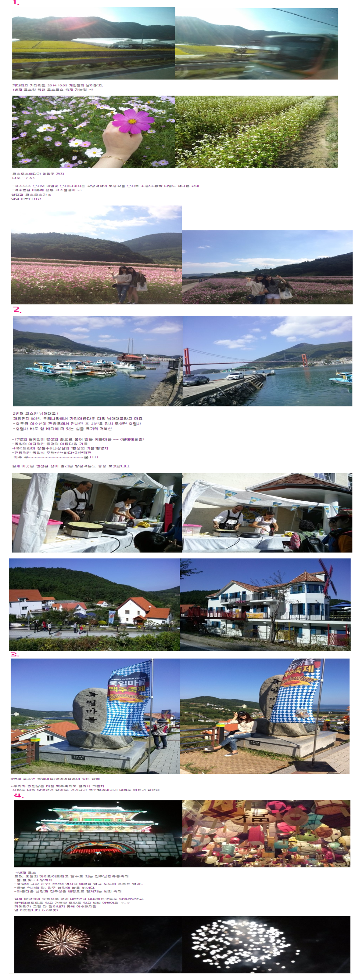 제목 | ★우정여행★가을여행★북천코스모스축제,남해독일마을,진주남강유등축제 | 등록일 | 14.10.26 | 조회 | 334 |