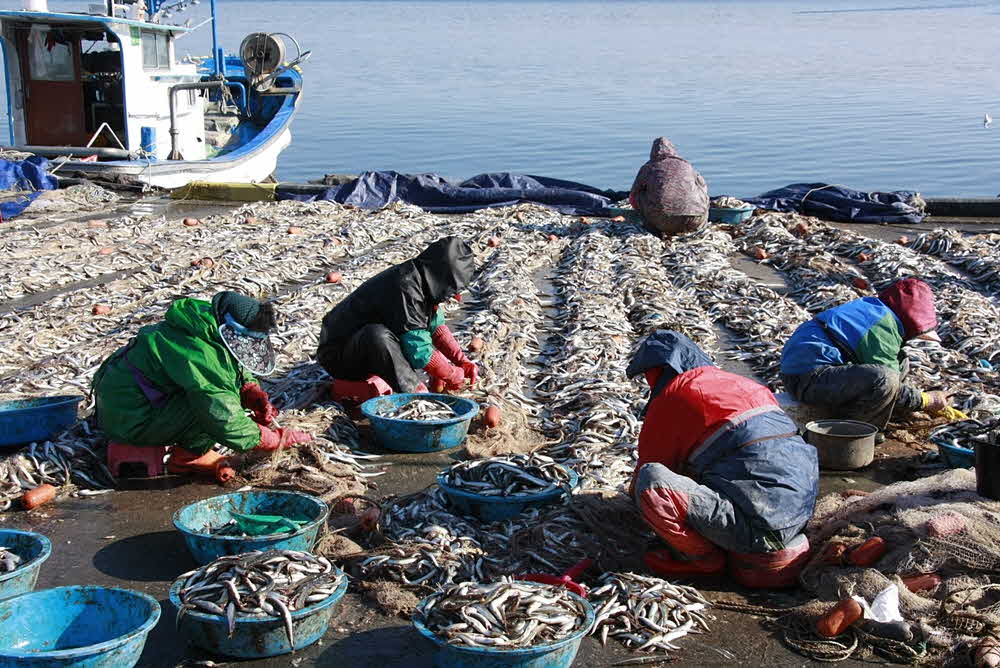 주문진항은어족이 풍부하여 드나드는배가 많을 뿐 아니라  여행객들이 항상 붐비는 곳입니다.  특히 겨울철에는 게, 오징어. 명태. 양미리 등이많아요. 갓 잡아온 양미리를 바쁘게 손질하는  아낙네들의 모습입니다.
