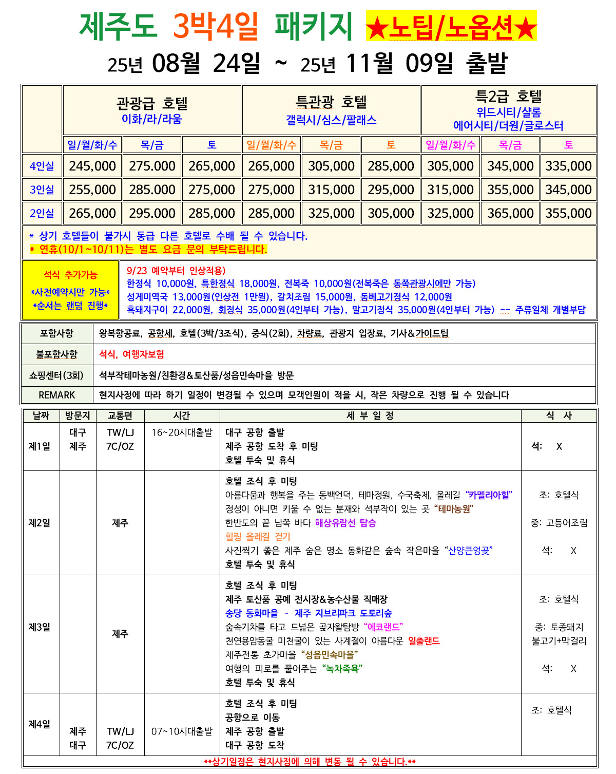 ★특가★ 제주도 3박4일 패키지 [대구오후출발/제주오전출발]