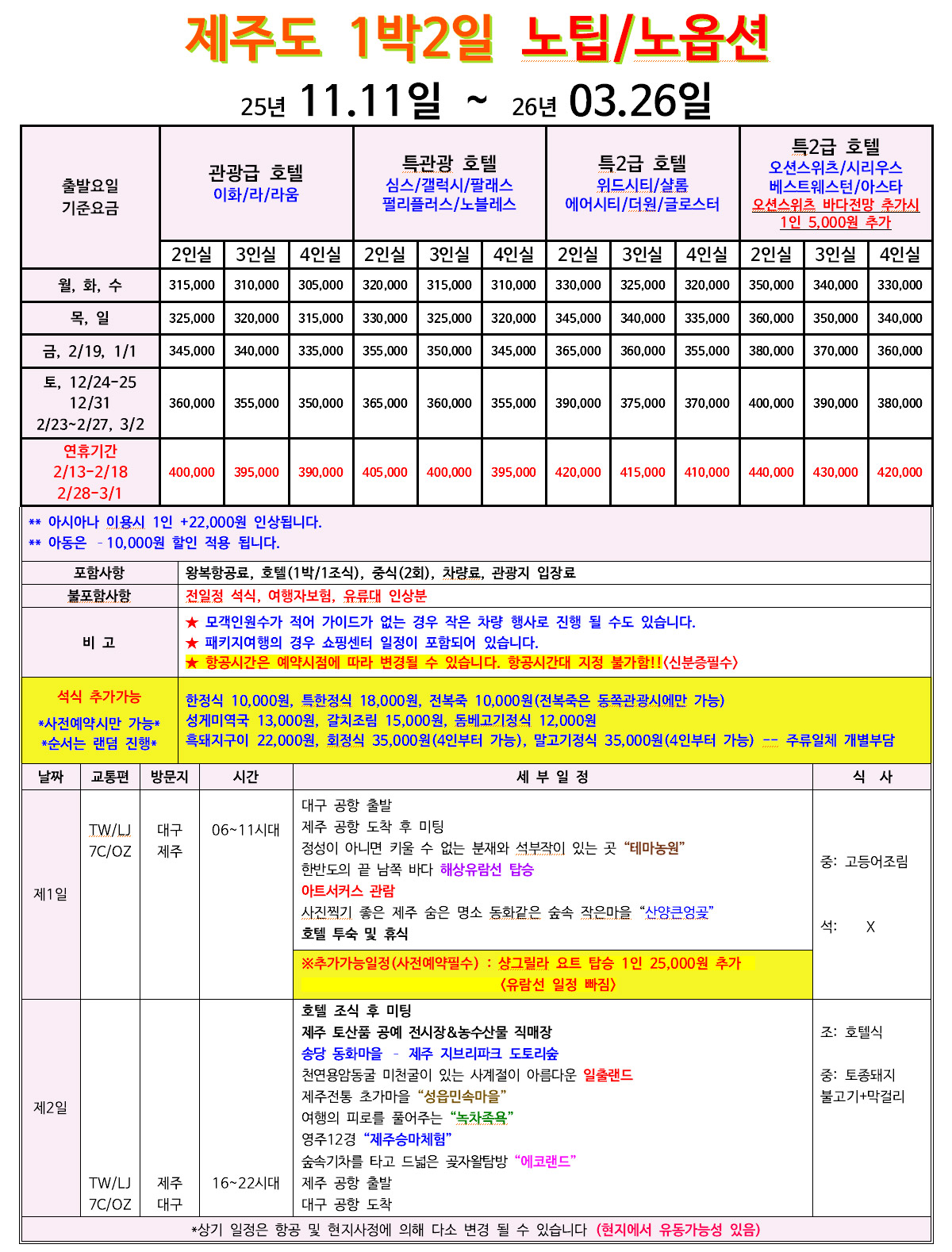 고객께서 예약하신 사항(출발일자/요일/행선지등)은 출발하루전 문자로 일괄 발송하니, 본인의 예약사항이 틀릴 경우 바로 연락 부탁드립니다. (혹, 여행출발 후 연락시 당일취소로 처리 됩니다)