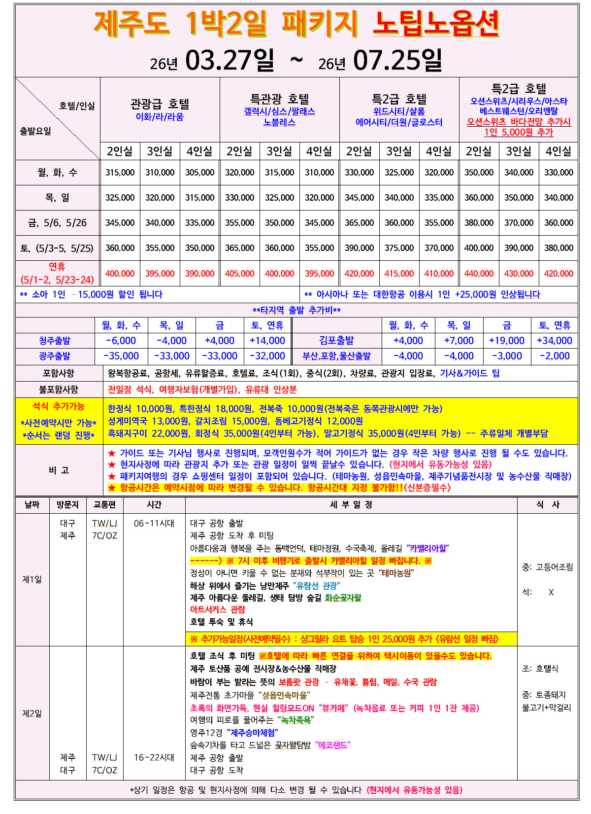 고객께서 예약하신 사항(출발일자/요일/행선지등)은 출발하루전 문자로 일괄 발송하니, 본인의 예약사항이 틀릴 경우 바로 연락 부탁드립니다. (혹, 여행출발 후 연락시 당일취소로 처리 됩니다)