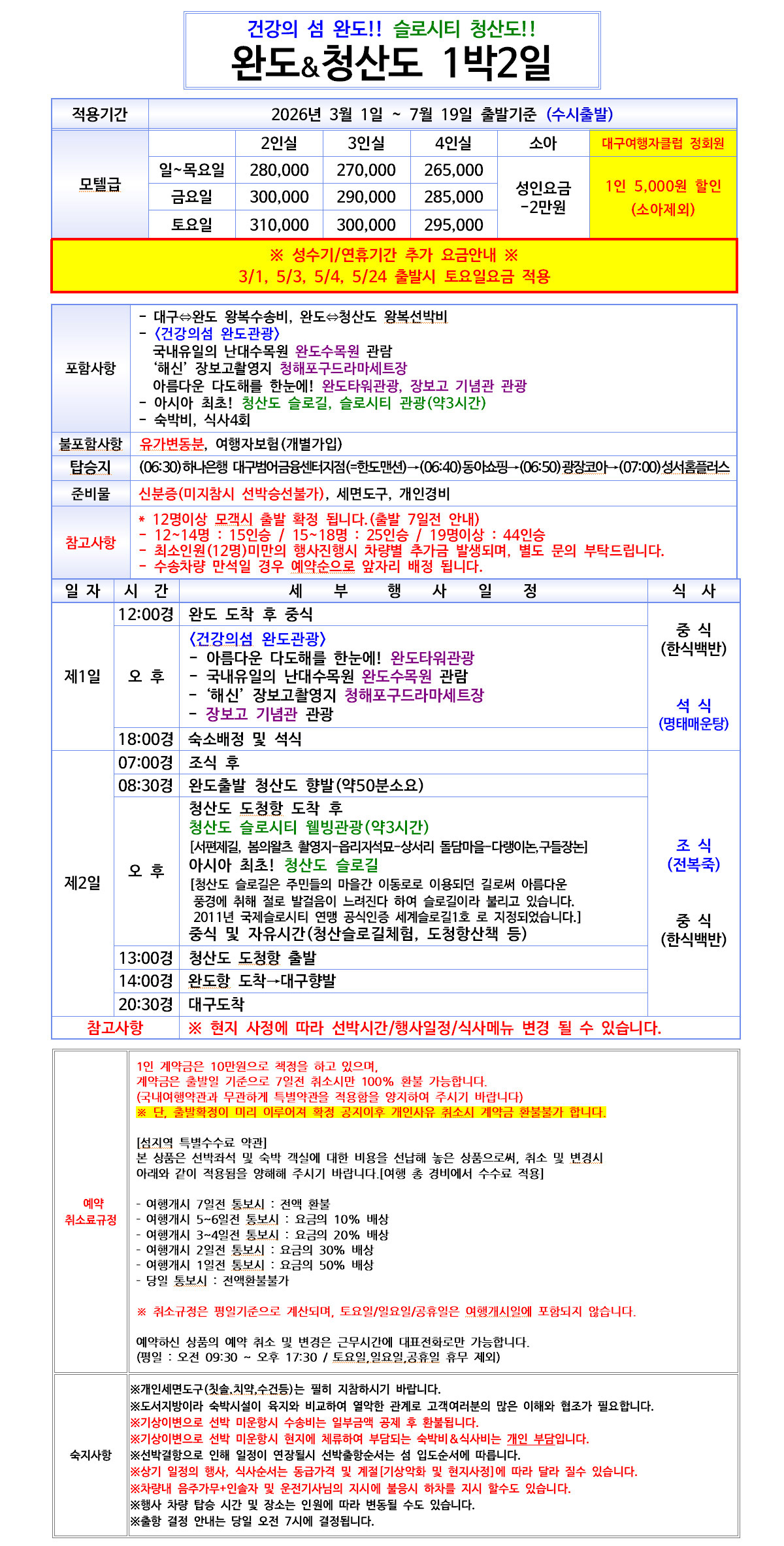 고객께서 예약하신 사항(출발일자/요일/행선지등)은 출발하루전 문자로 일괄 발송하니, 본인의 예약사항이 틀릴 경우 바로 연락 부탁드립니다. (혹, 여행출발 후 연락시 당일취소로 처리 됩니다)