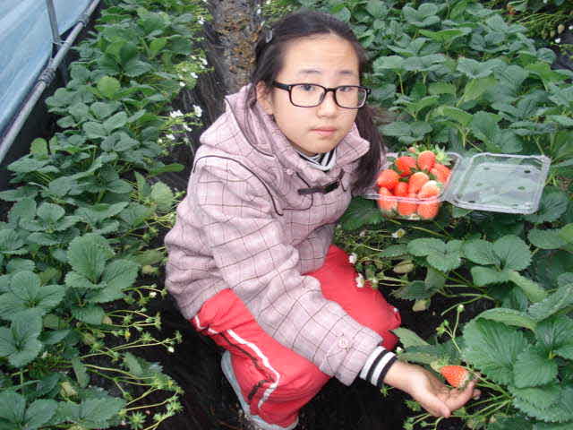 딸기밭 체험 중