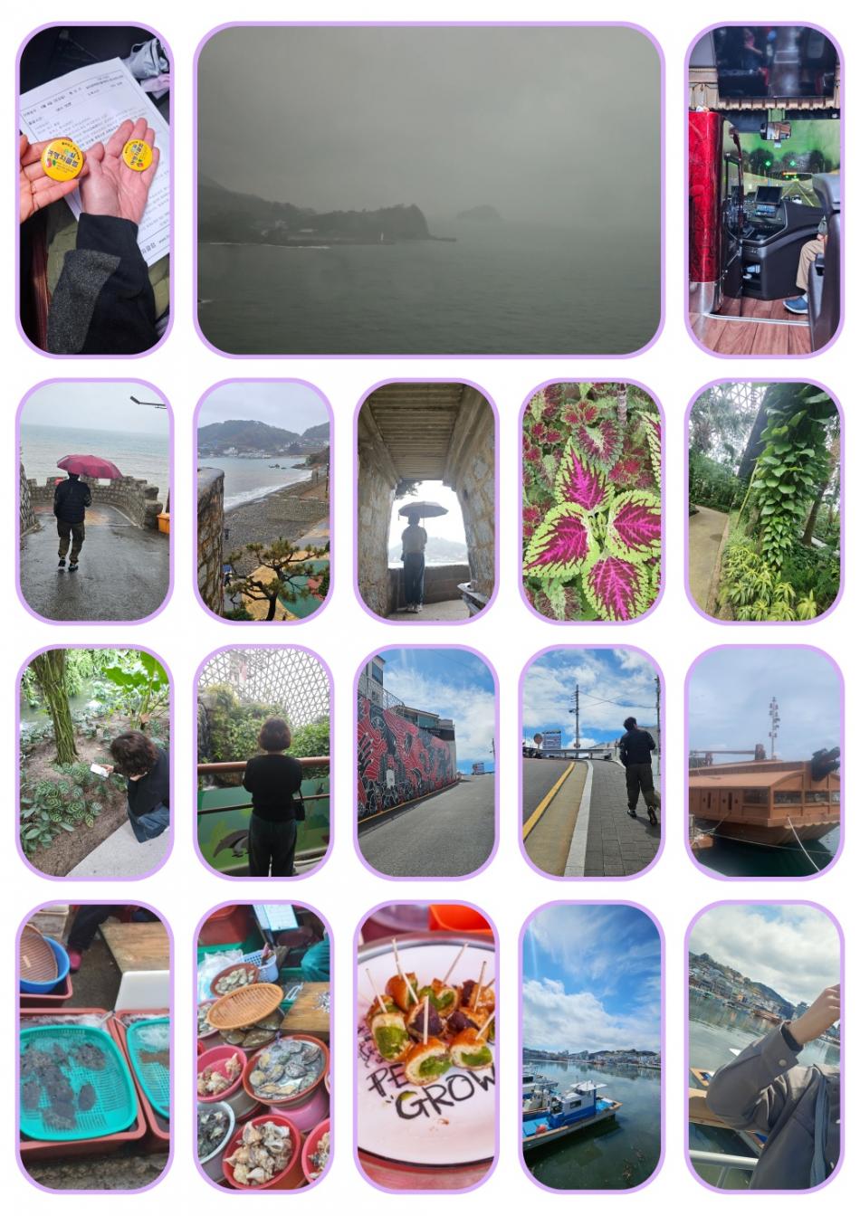 비가 내리는 아침, 배를 타고 지심도를 가려던 계획은 아쉽게도 결항으로 바뀌게 되었다. 대신 찾은 매미성은 태풍 매미 이후 한 사람이 오랜 시간 정성껏 쌓아 올린 곳으로, 유럽의 중세 성을 떠올리게 하는 이국적인 풍경이 인상적이었다. 이어 비를 피해 들른 거제 식물원에서는 다양한 꽃들을 감상하며 잠시 여유를 즐겼다. 이후 도착한 통영중앙시장에서는 언제 비가 왔냐는 듯 맑게 개인 하늘 아래 맛있는 점심과 싱싱한 회, 달콤한 꿀빵까지 즐기며 여행의 즐거움을 더했다. 마지막으로 동피랑 벽화마을을 둘러보며 알록달록한 풍경 속에서 하루를 기분 좋게 마무리했다. 이날 단 청일점이 제 옆에 앉은분 ㅋㅋ |