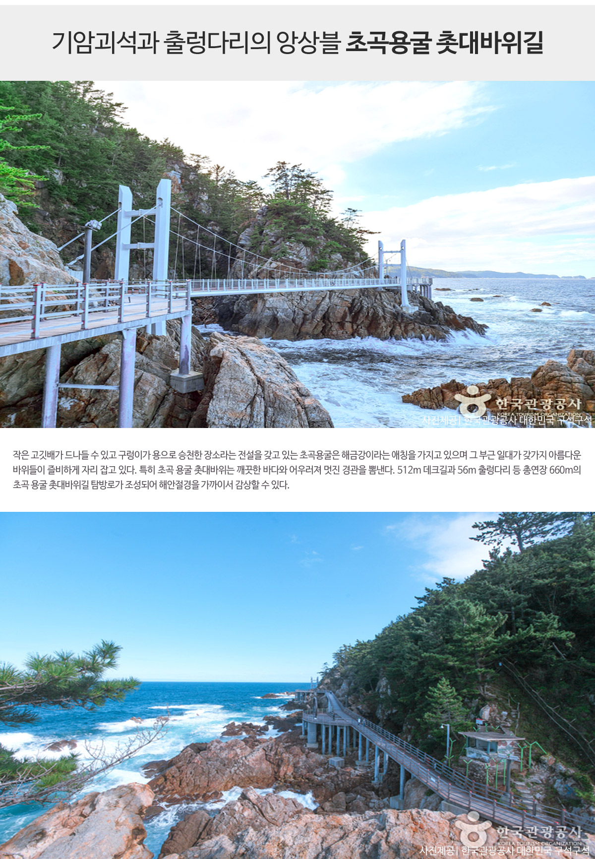 - 512m 데크길과 56m 출렁다리등 탐방로가 조성되어 해안절경을 가까이서 감상할 수 있는 곳