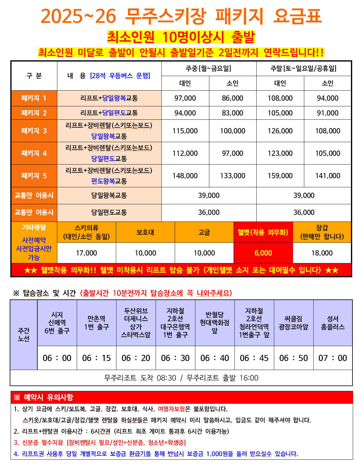 - 천재지변(=날씨등)으로 인하여 스키장 출입이 제한되거나, 중간에 돌아올 경우 교통비를 제외한 여행경비를 환불해 드립니다.