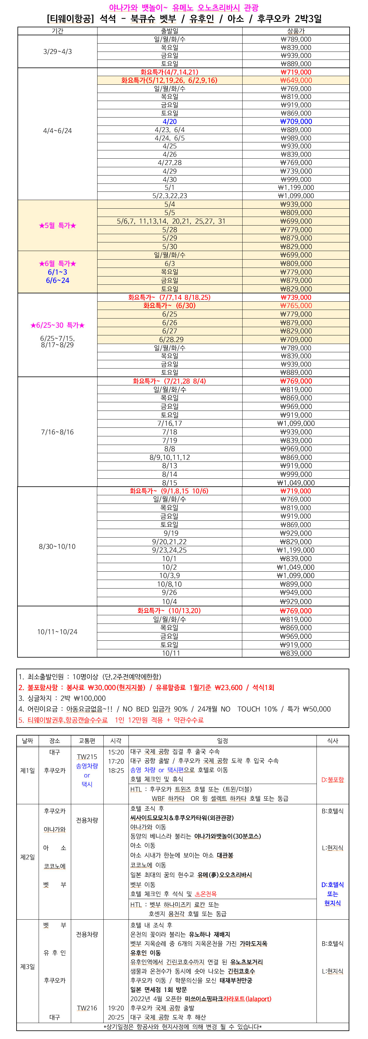 [오후출발 3/29~10/24] 북큐슈 벳부/유후인/아소/야나가와뱃놀이/후쿠오카 3일